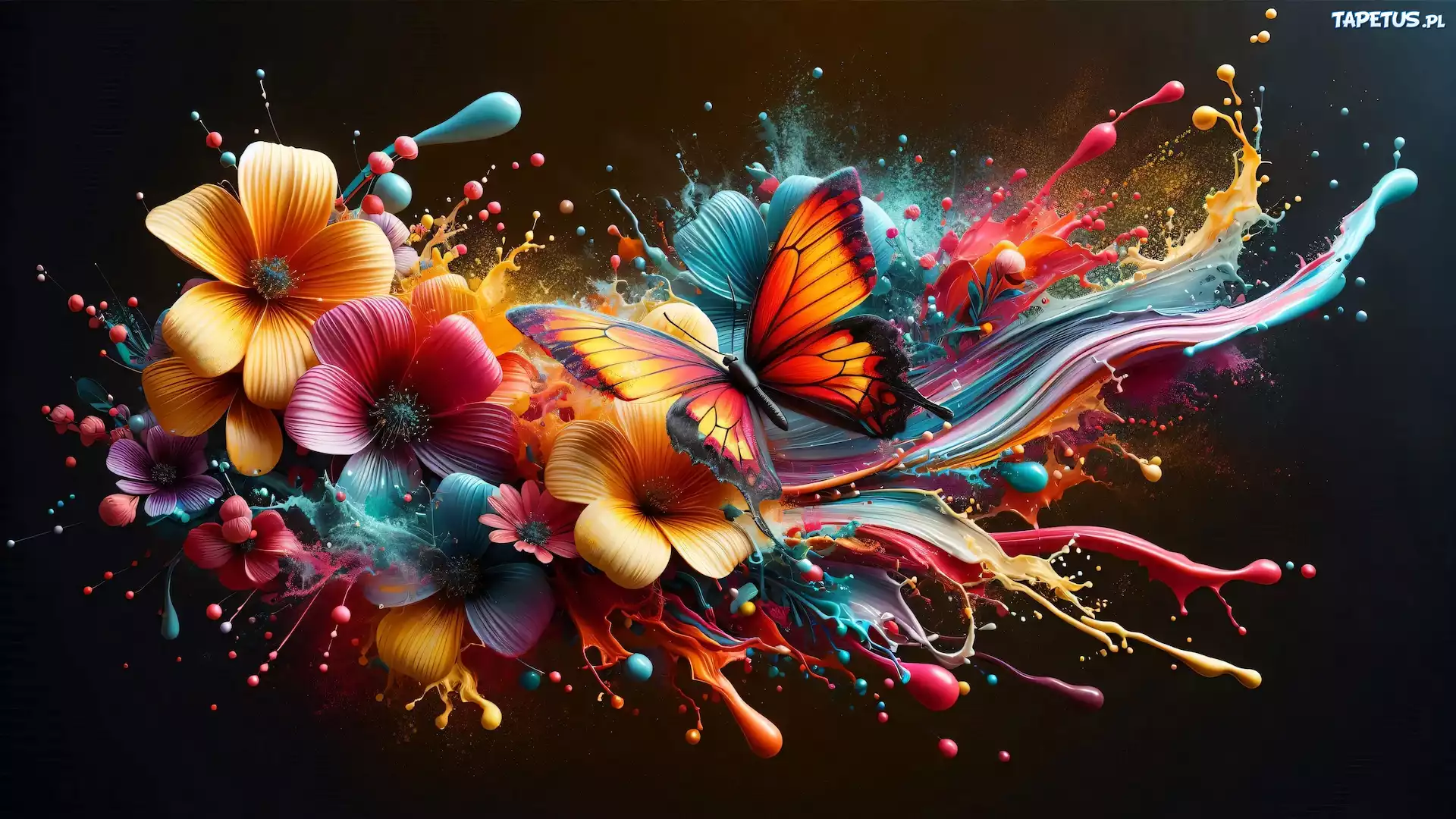 Tapeta Grafika, Kwiaty, Kolorowe, Motyl, Farby