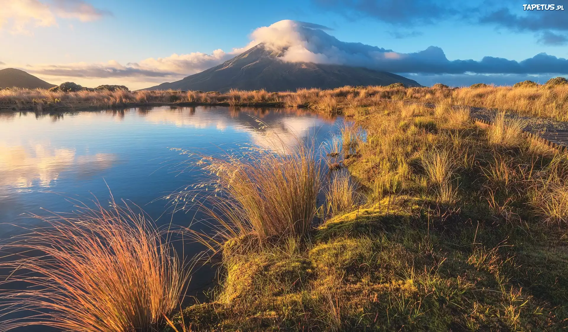 Tapeta Nowa Zelandia, Góra, Taranaki, Park Narodowy Egmont, Staw Pouakai, Trawa, Chmury, Odbicie