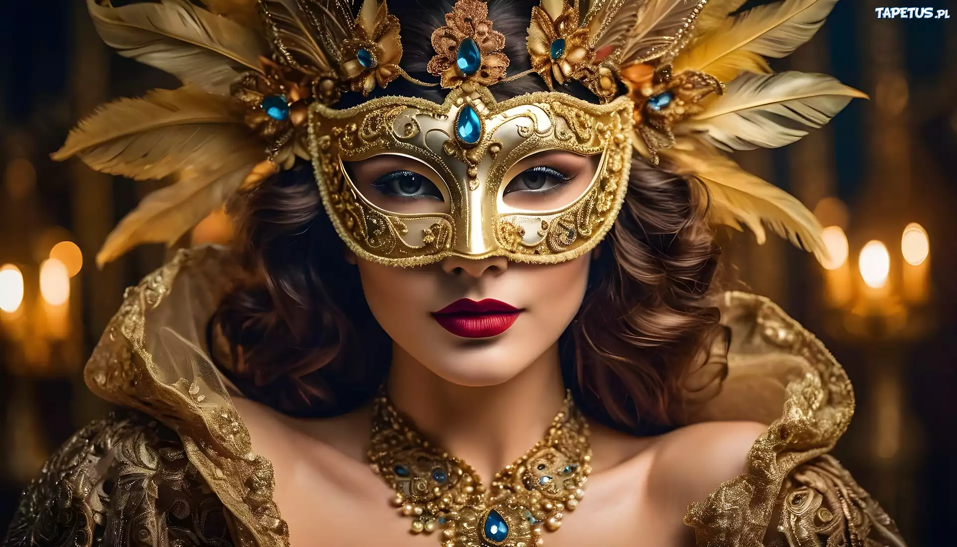 Tapeta Kobieta, Maska, Karnawałowa, Biżuteria, Pióra