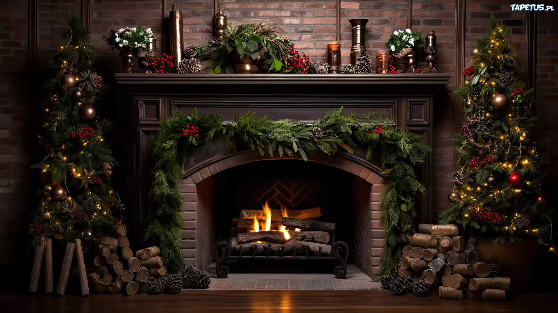 Tapeta Choinki, Kominek, Dekoracje, Boże Narodzenie, Grafika AI