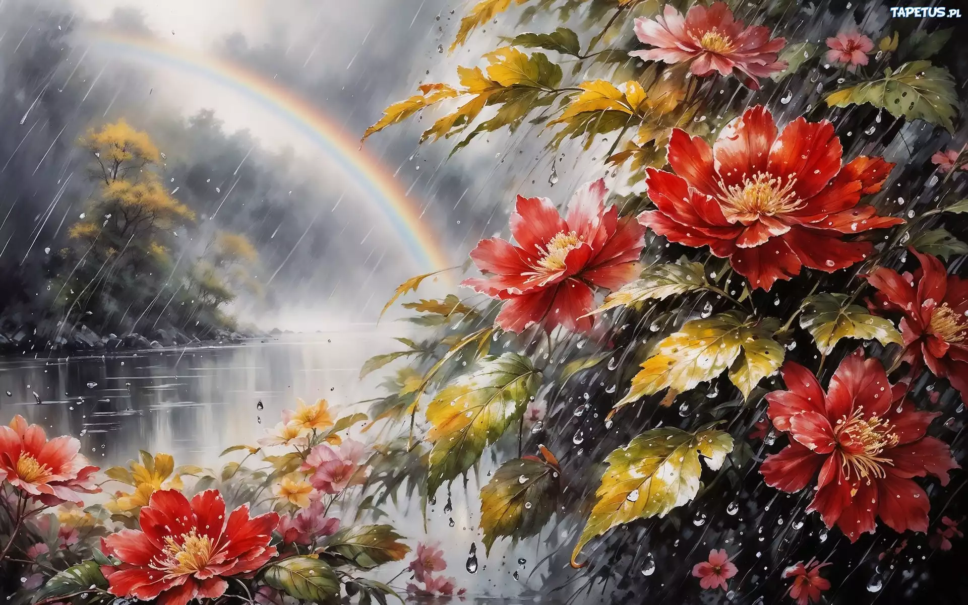 Tapeta Grafika, Kwiaty, Deszcz, Tęcza