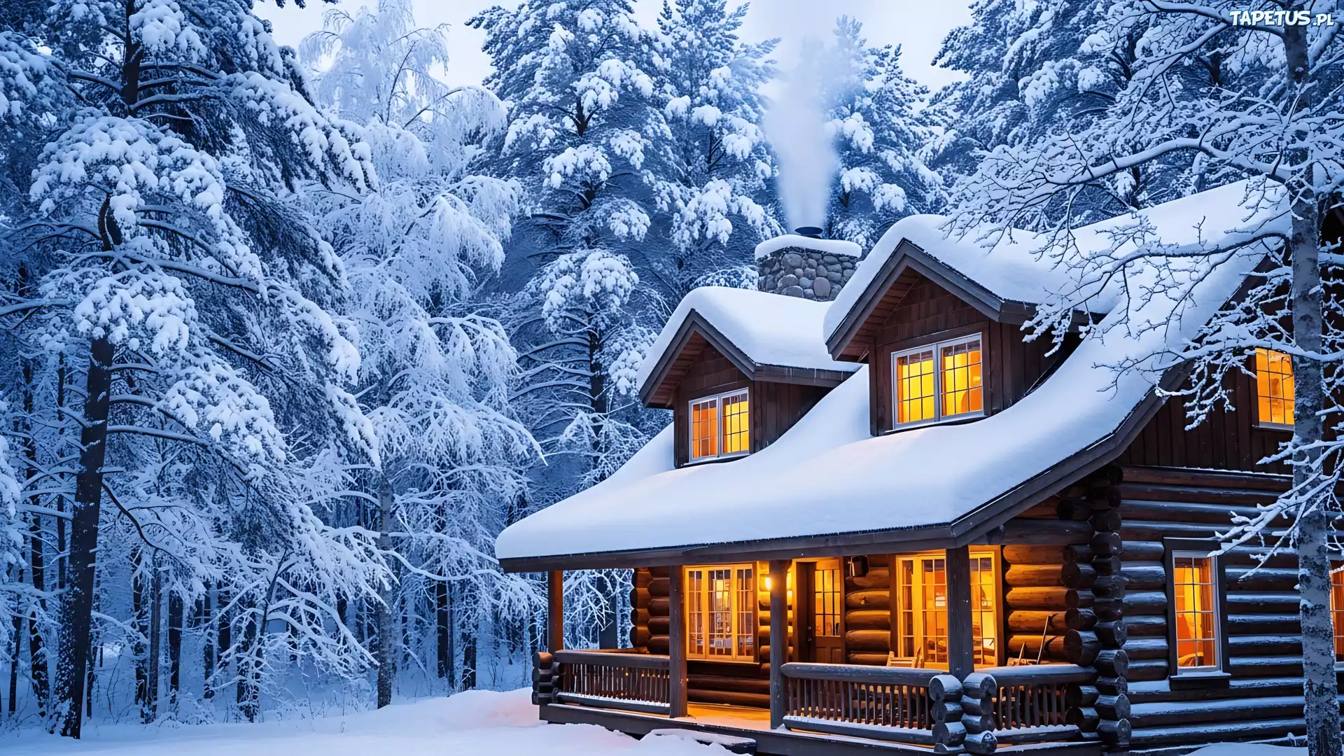 Słowa Kluczowe: Zima , Las , Ośnieżone , Drzewa , Oświetlony , Dom , Śnieg