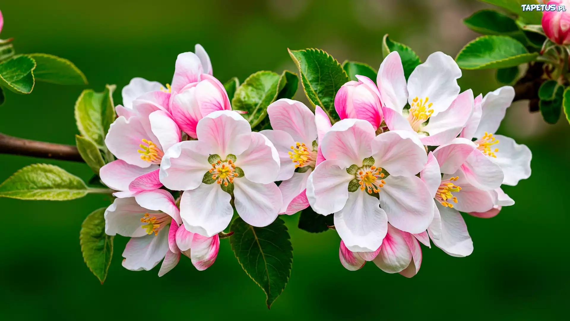 Tapeta Drzewo, Owocowe, Kwiaty, Biało-różowe, Liście, Gałązka