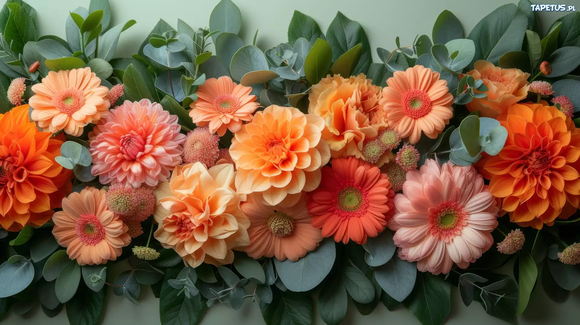 Tapeta Pomarańcze, Kwiaty, Gerbery, Dalie, Listki