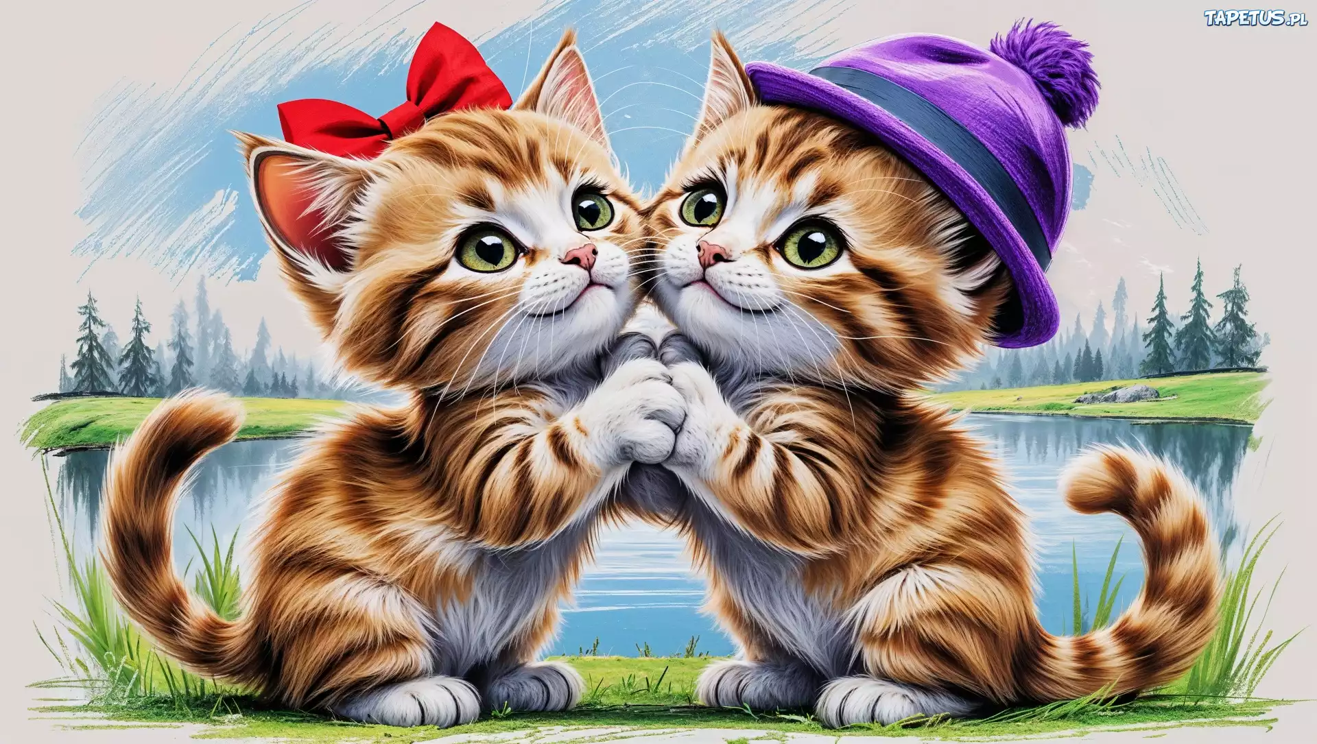 Tapeta Dwa, Koty, Rude, Kokarda, Kapelusz, Grafika