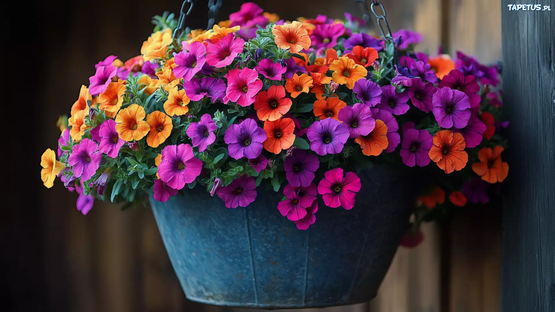 Tapeta Kwiaty, Kolorowe, Petunie, Wisząca, Doniczka