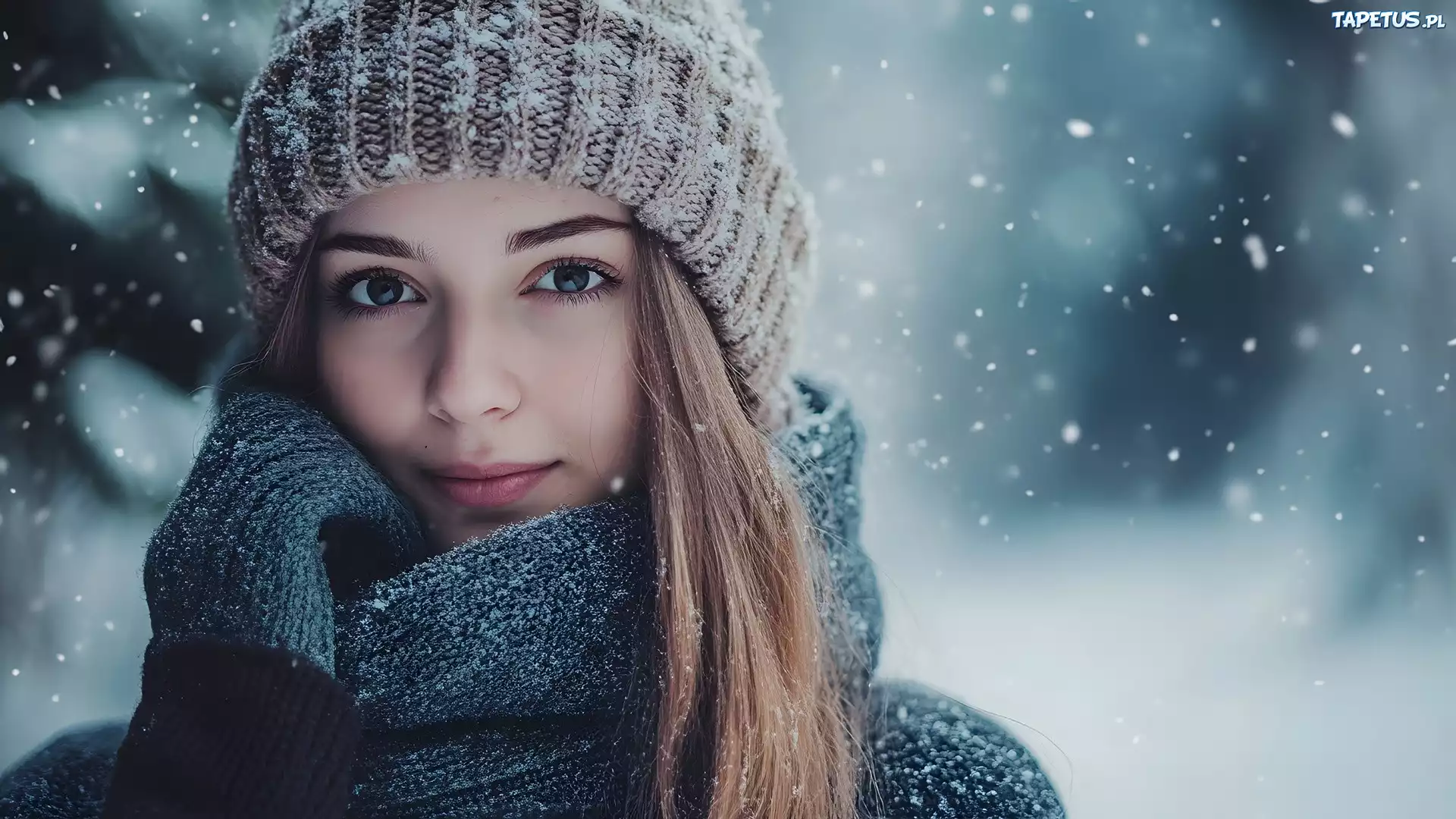 Tapeta Długowłosa, Kobieta, Ośnieżona, Czapka, Szal, Rękawice