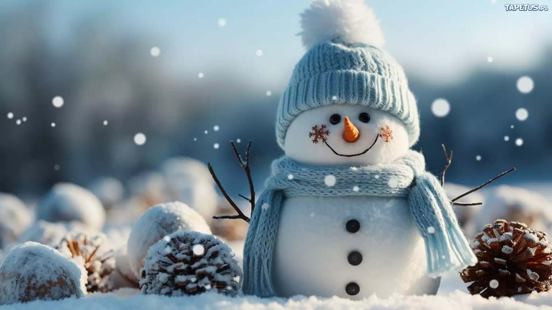 Tapeta Zima, Bałwan, Czapka, Szalik, Szyszki, Śnieg, Grafika