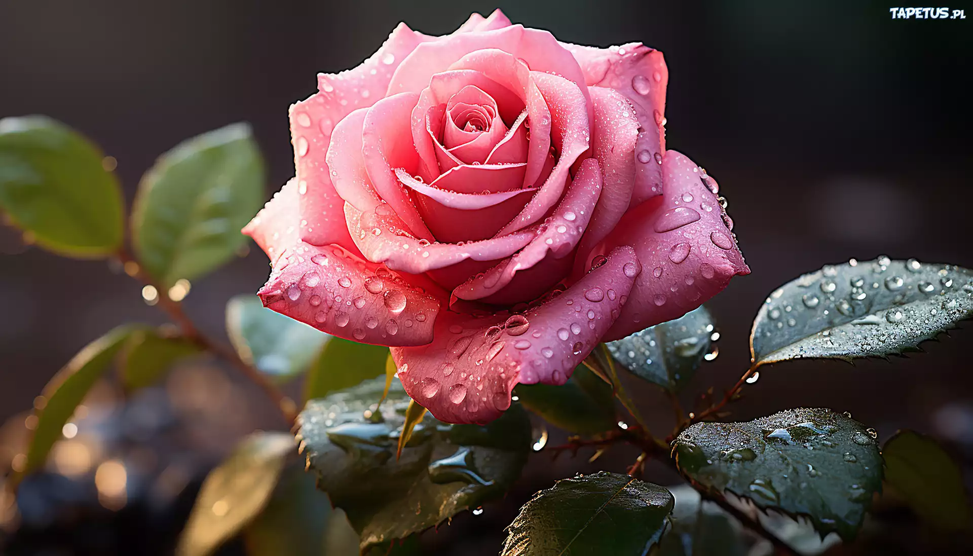 Tapeta Kwiat, Róża, Różowa, Liście, Krople, Grafika