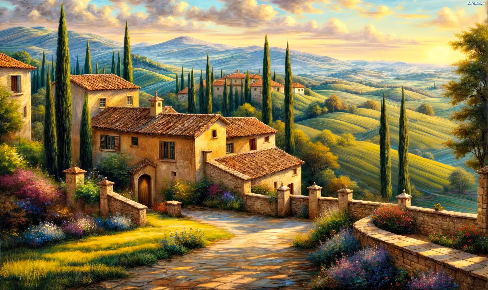 Tapeta Włochy, Toskania, Domy, Drzewa, Góry, Niebo, Grafika