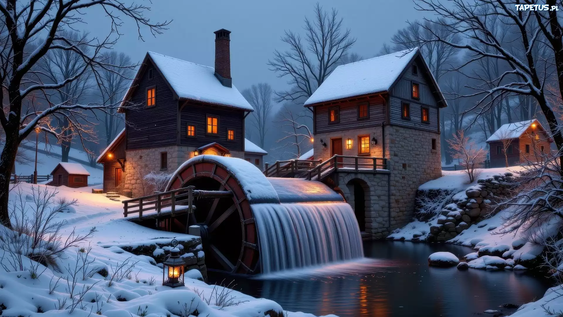 Tapeta Zima, Noc, Młyn, Wodny, Rzeka, Oświetlone, Domy, Drzewa, Śnieg, AI