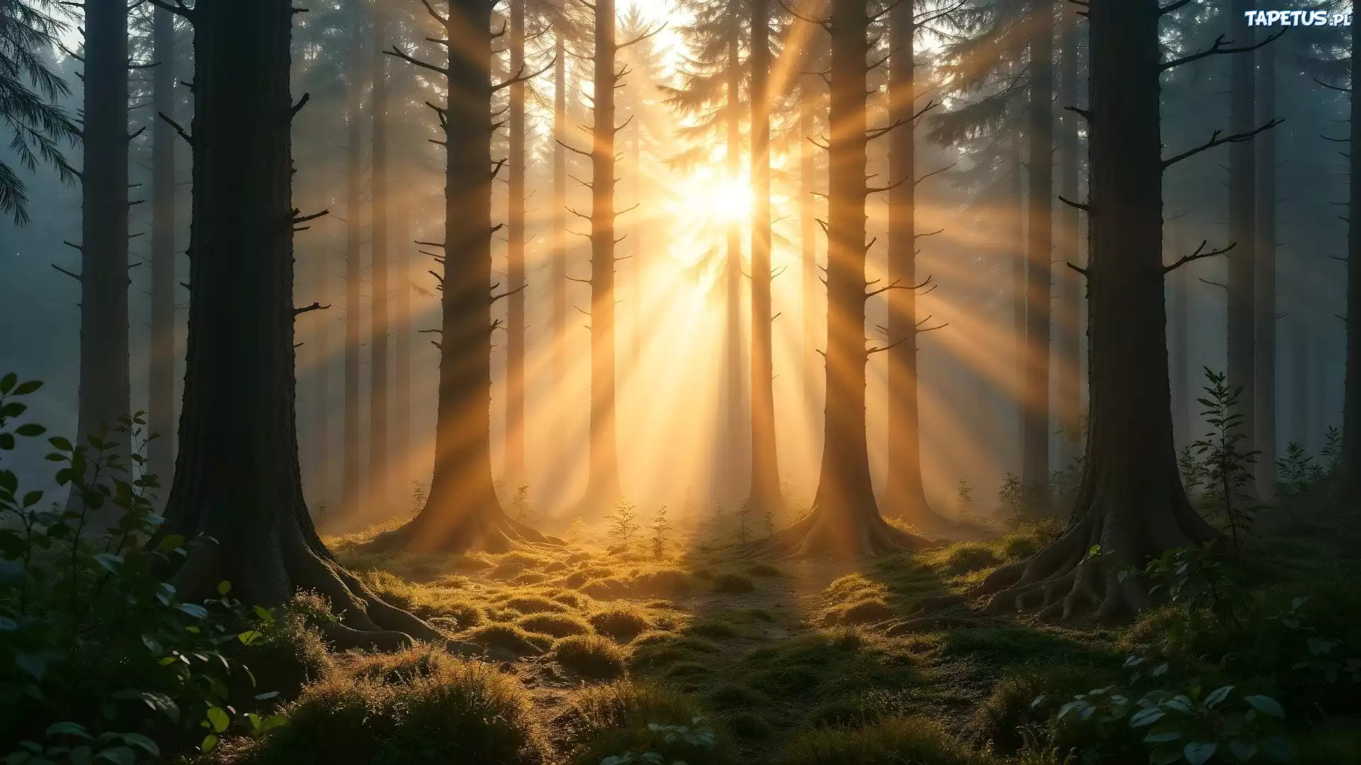 Tapeta Las, Drzewa, Mgła, Przebijające światło