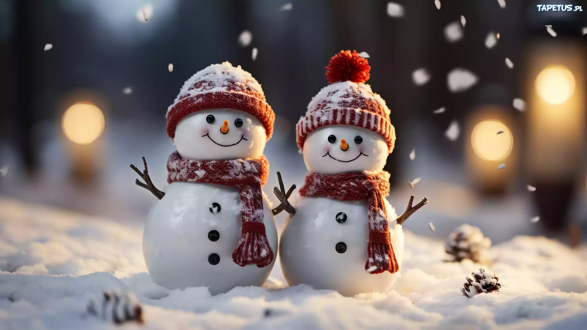 Tapeta Zima, Dwa, Bałwanki, Czerwone, Czapki, Szaliki, Śnieg