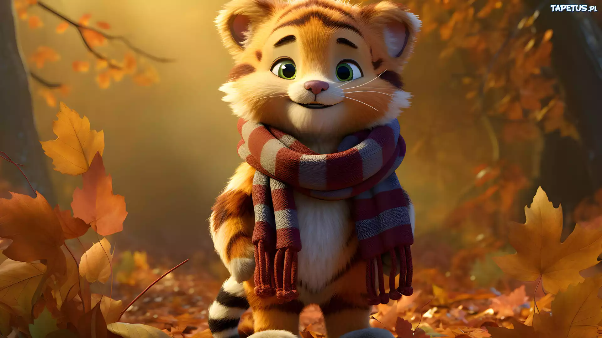 Słowa Kluczowe: Jesień , Las , Drzewa , Tygrys , Uśmiech , Szalik , Liście , Grafika
