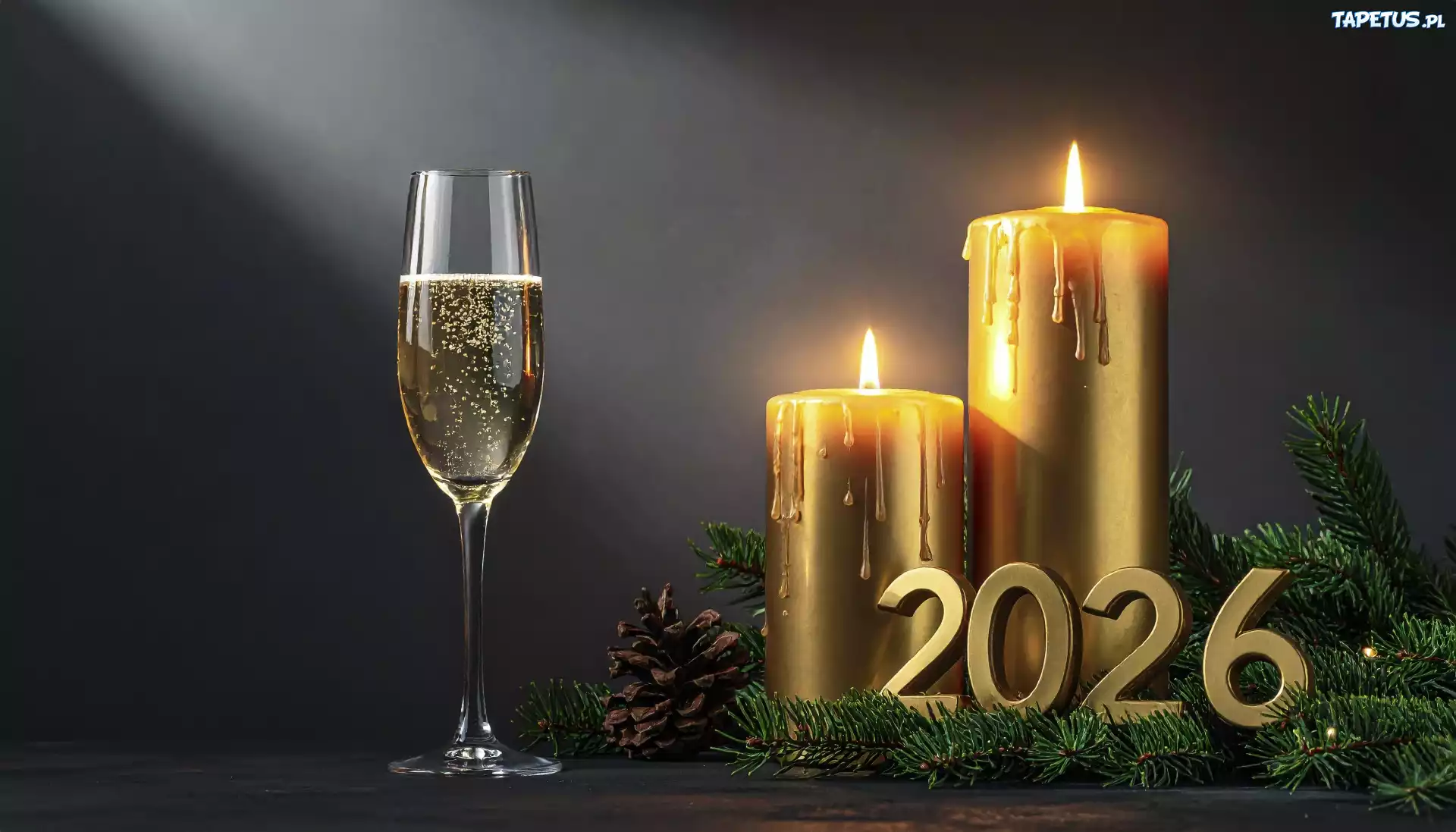 Tapeta Data, Nowy Rok, 2026, Kieliszek, Szampan, Świece, Gałązki, Szyszka