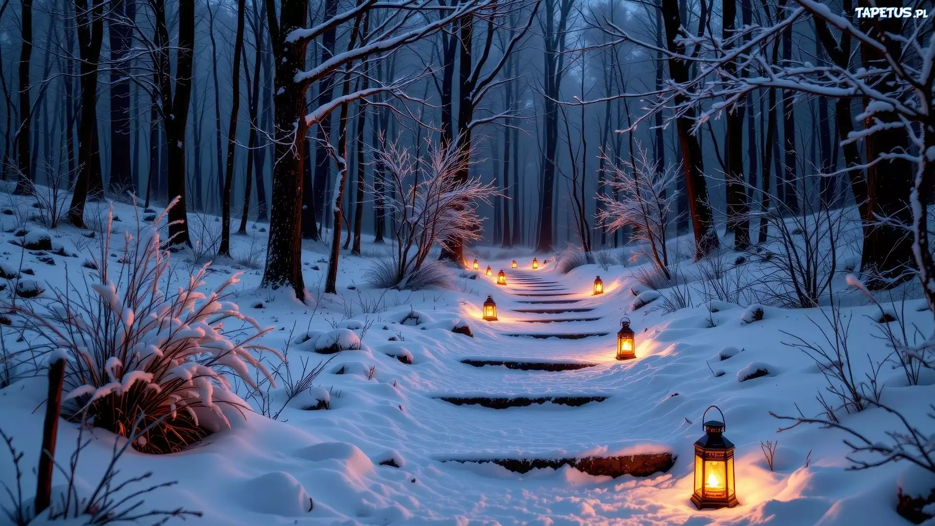 Słowa Kluczowe: Zima , Las , Ośnieżone , Drzewa , Schody , Lampiony