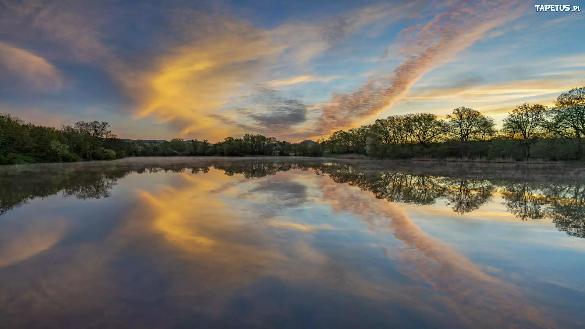 Tapeta Wschód słońca, Drzewa, Jezioro Sterenbachsee, Dolina Wittlicha, Niemcy