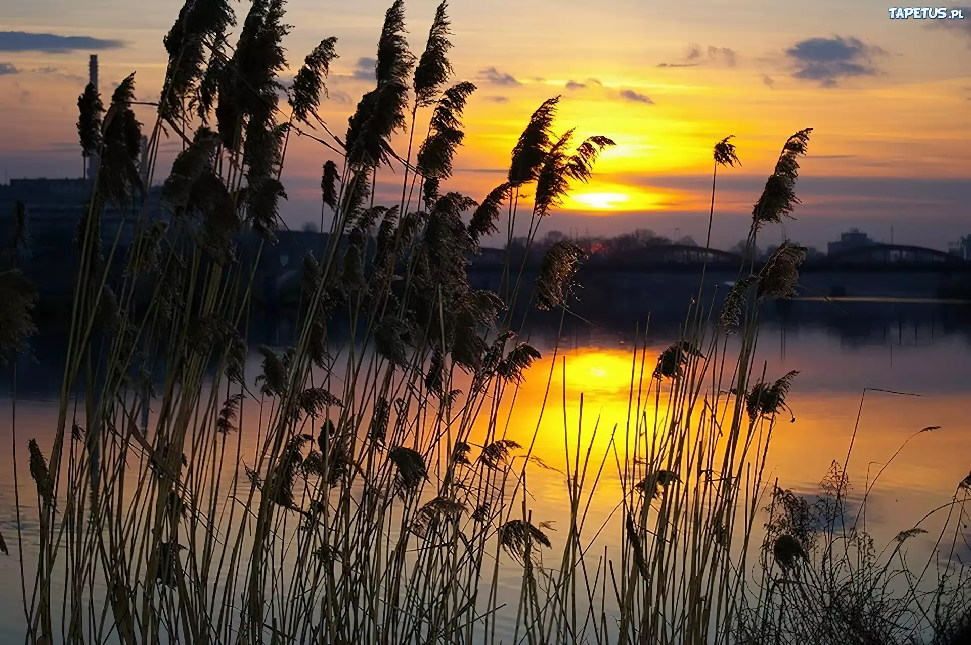 Tapeta Jezioro, Zachód, Słońca, Trzcina