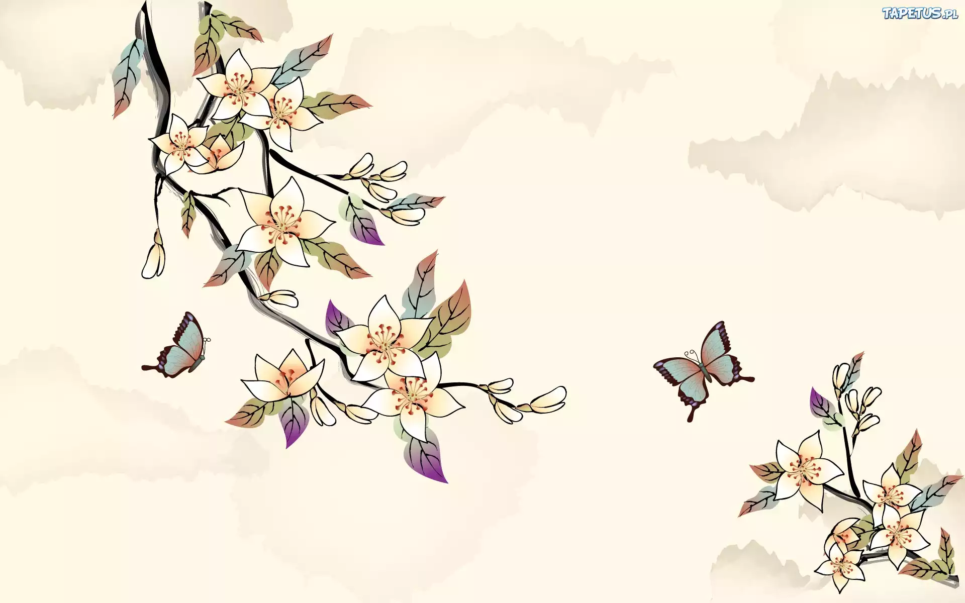 Tapeta Gałązki, Kwitnące, Kwiaty, Biało, Pomarańczowe, Motyle